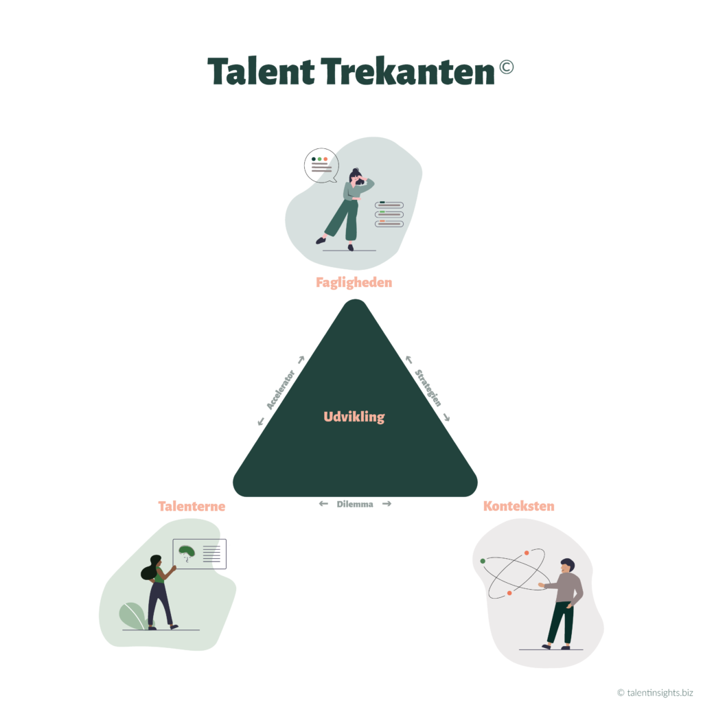 Et hjælpeværktøj til at få styr på de 3 perspektiver er den populære Talent Trekant. Her har du en model som hjælper dig med at få styr på de 3 enkelte emner, og så samtidig skabe overblik over hvordan de påvirker og er afhængig af hinanden.