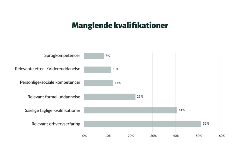 33 % af virksomhedernes rekrutteringsforsøg var forgæves, 18 % endte med at stillingen ikke blev besat (72.300), mens 13 % af virksomhedernes stillinger blev besat af en kandidat, som ikke havde alle de ønskede kvalifikationer.