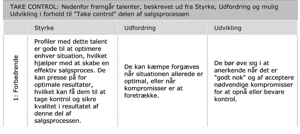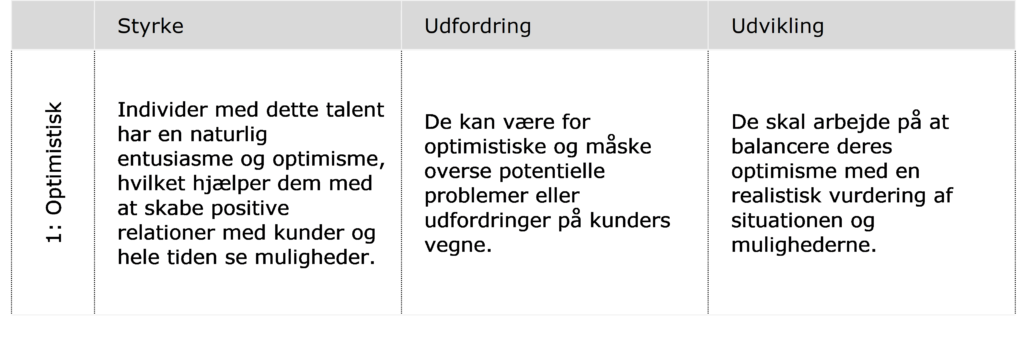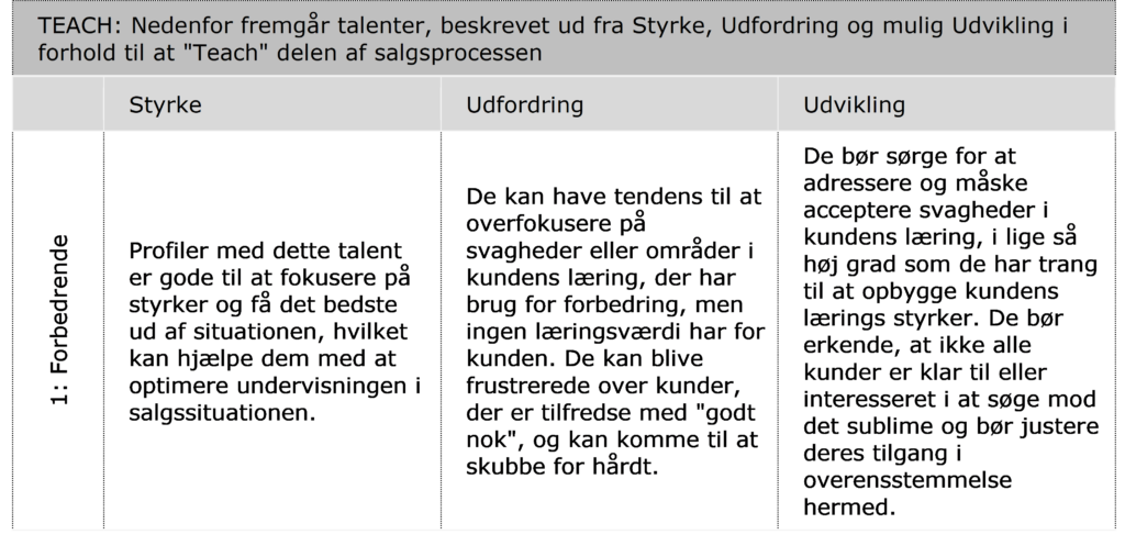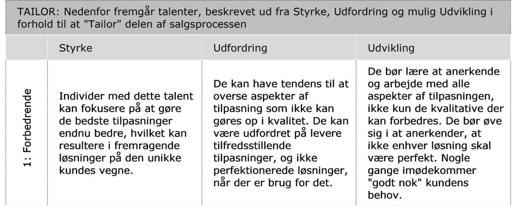 - Udvikle evnen til at være agil og forandringsparat i brugen af talentet, så man ikke blot tænker i termer af styrker og udfordringer, men reflekterer over, hvordan talentet kan forvaltes i forhold til udfordrer-salgsprocessen.