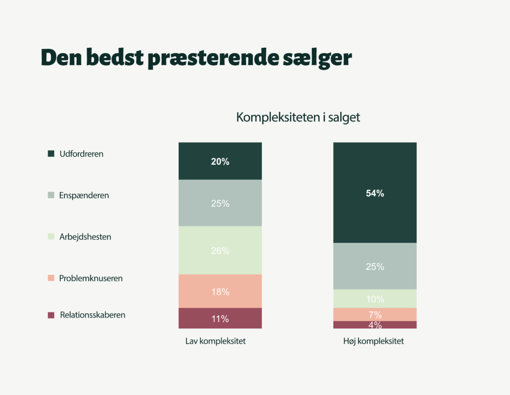 Udfordreren klarer sig bedre end Relationsskaberen og Problemknuseren i en salgsprocess af lav kompleksitet. Og næsten lige så godt som Arbejdshesten og Enspænderen.